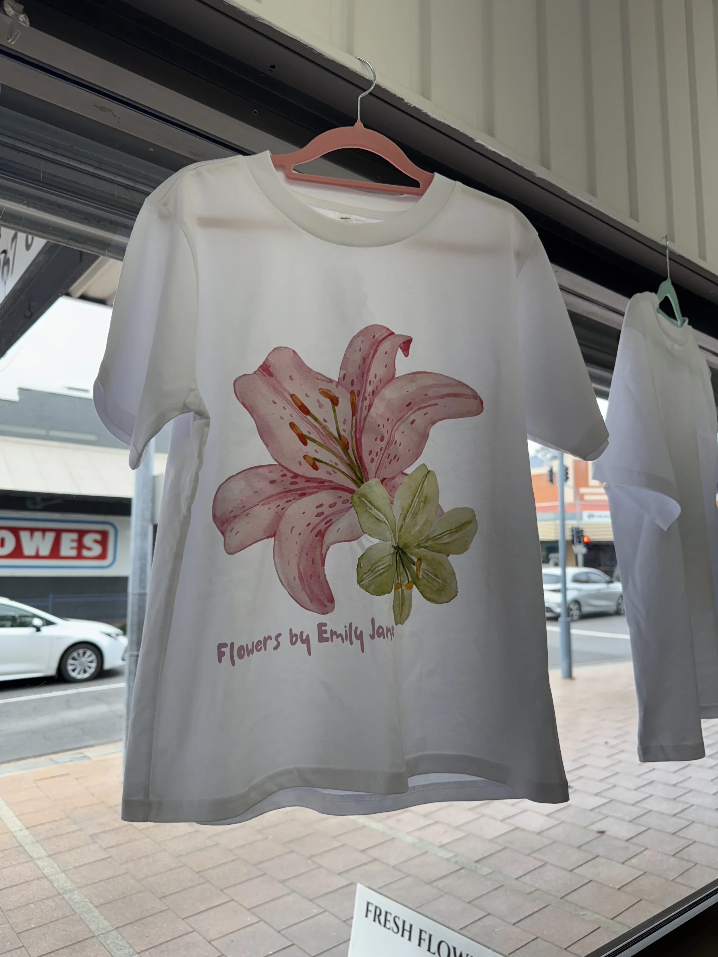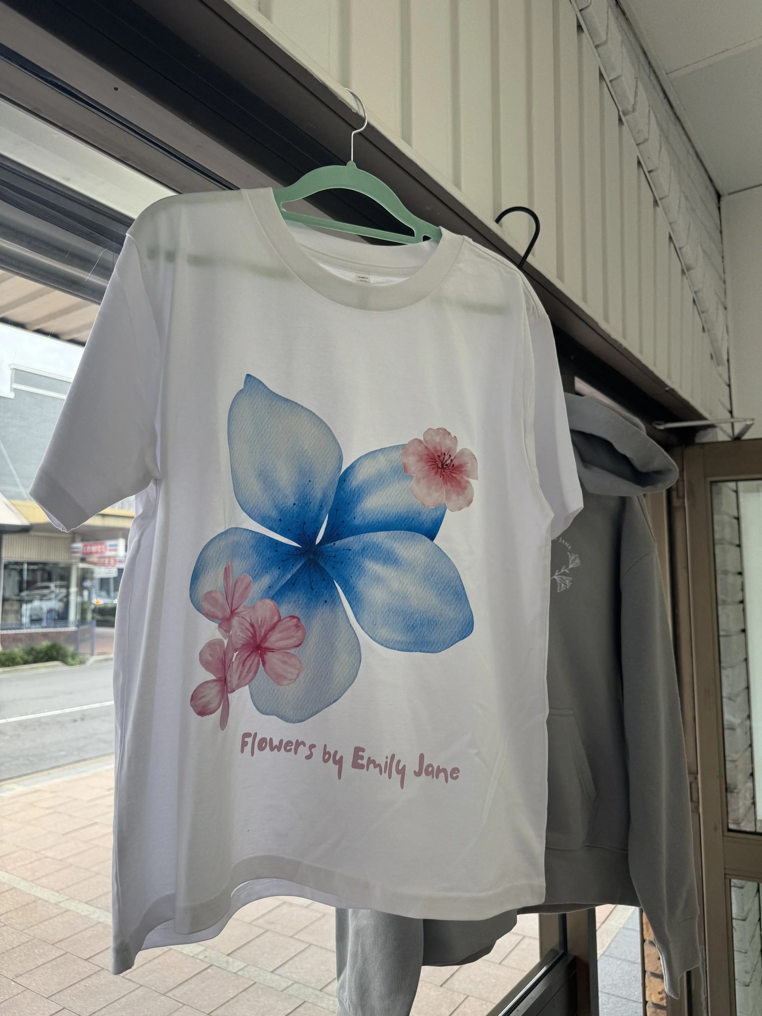White tees with our custom floral design — 100% combed cotton (220gsm), locally printed by another small business.