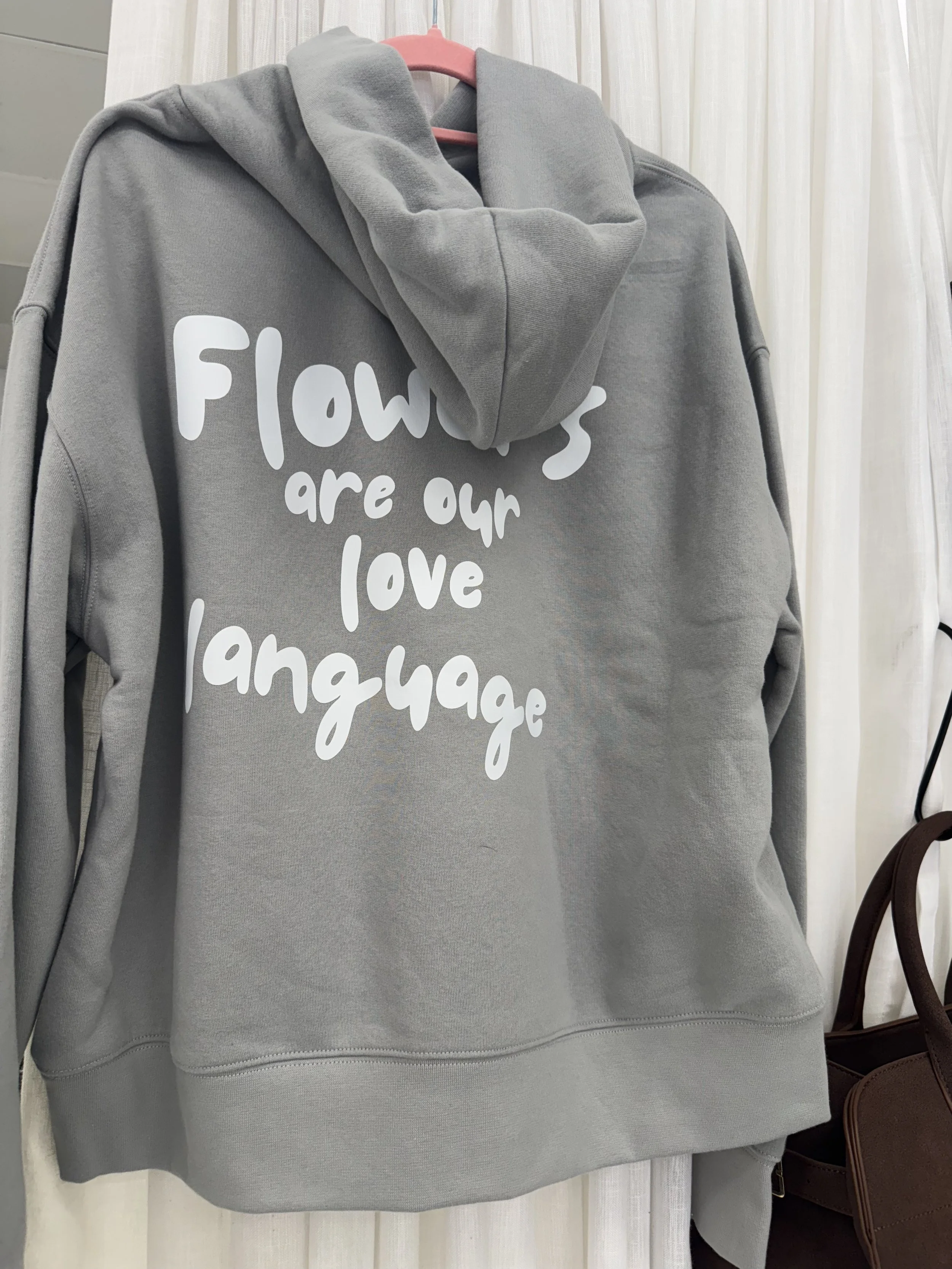 Steel-grey hoodies with our “Flowers are our love language” print mid mid-weight, 320 GSM, 80% cotton / 20% recycled polyester CVC fleece.